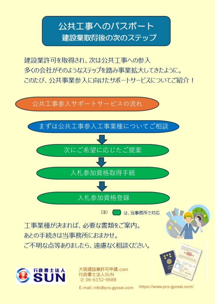 当事務所は、建設業新規許可・更新申請手続きはもちろん、経営事項審査申請(経審)及び入札参加資格申請の手続きを代行させていただいています。