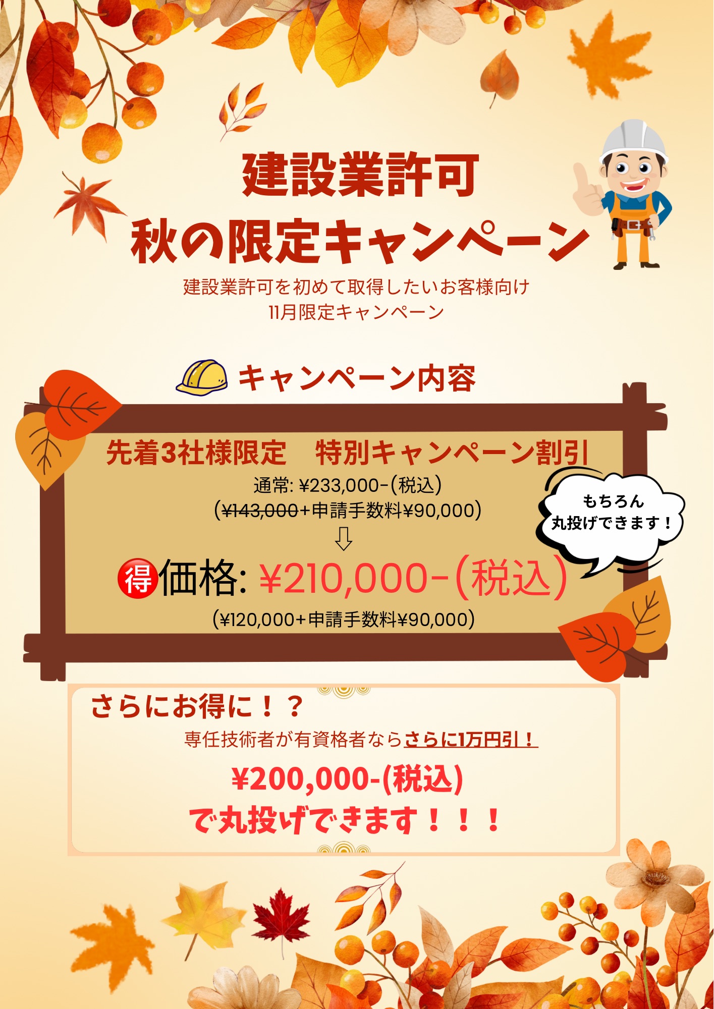 建設業許可を初めて取得したいお客様向けの11月限定キャンペーンです。